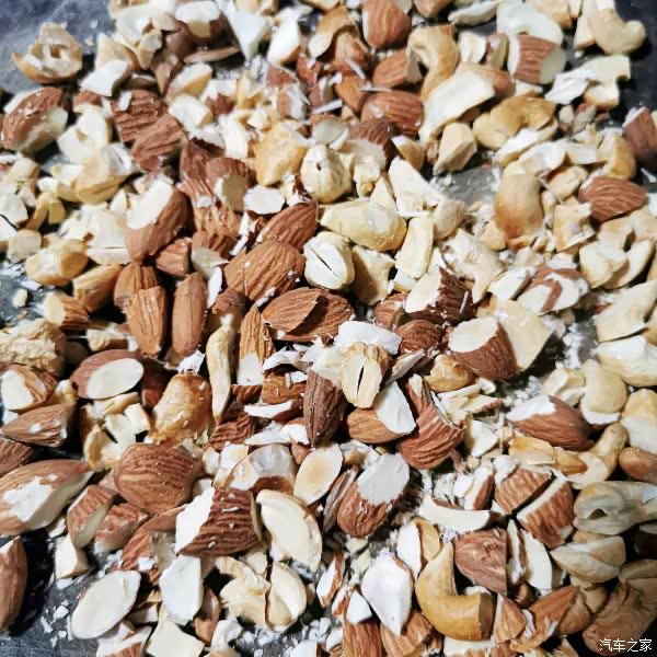 取60g烤香的腰果和60g杏仁,切成小块备用。