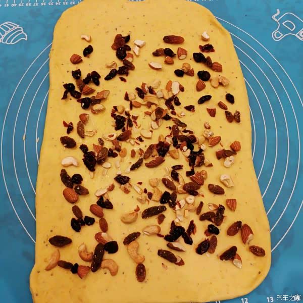 面团很硬,不用揉,直接用擀面杖擀成一个25cm×40cm大小的长方形,撒上120g坚果碎。