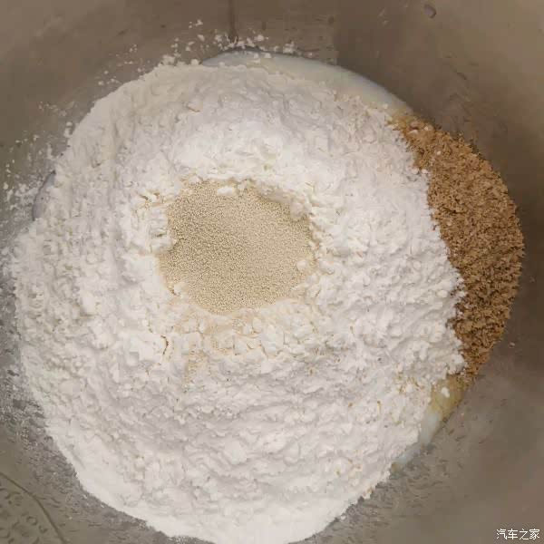 加入650g高筋面粉、10g小麦麸皮、10g奇亚籽,面粉中挖个洞,倒入9g耐高糖酵母。(如果气温很高,可以减少酵母用量,减到6g也是可以的,今天太冷了