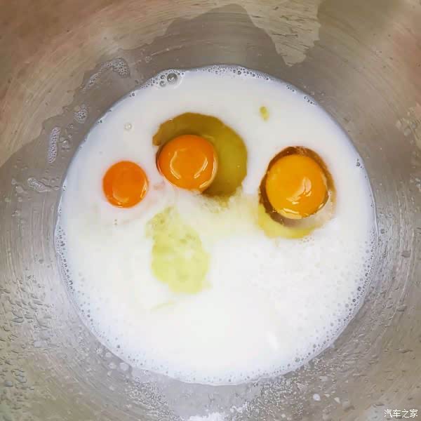 桶里倒入200g纯牛奶、100g白砂糖、40g蜂蜜、2g盐、三个鸡蛋(蛋液重约150g),如果大家的鸡蛋大了或者小了,那么纯牛奶的量也需要适当的增加或减少,来调节面包的干湿程度。