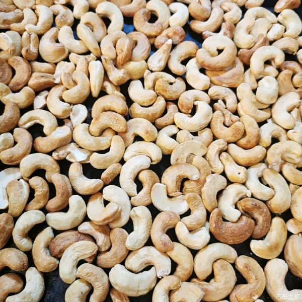 等待发酵的时候,可以先准备包进去的果仁:腰果我买的是生的,放入烤箱烤8分钟,烤到微微发黄,香脆。(如果你买的是熟腰果,可以省略这一步)