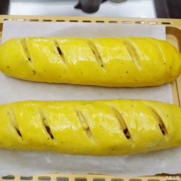 两个大列巴都卷好了之后,放入烤箱里进行二次发酵。(按照标准流程来说,二次发酵温度38度,湿度85%是最佳,如果烤箱没有加湿功能的,那么在面包下层放一个烤盘,里面倒上较烫的水,就可以创造出良好的湿度环境