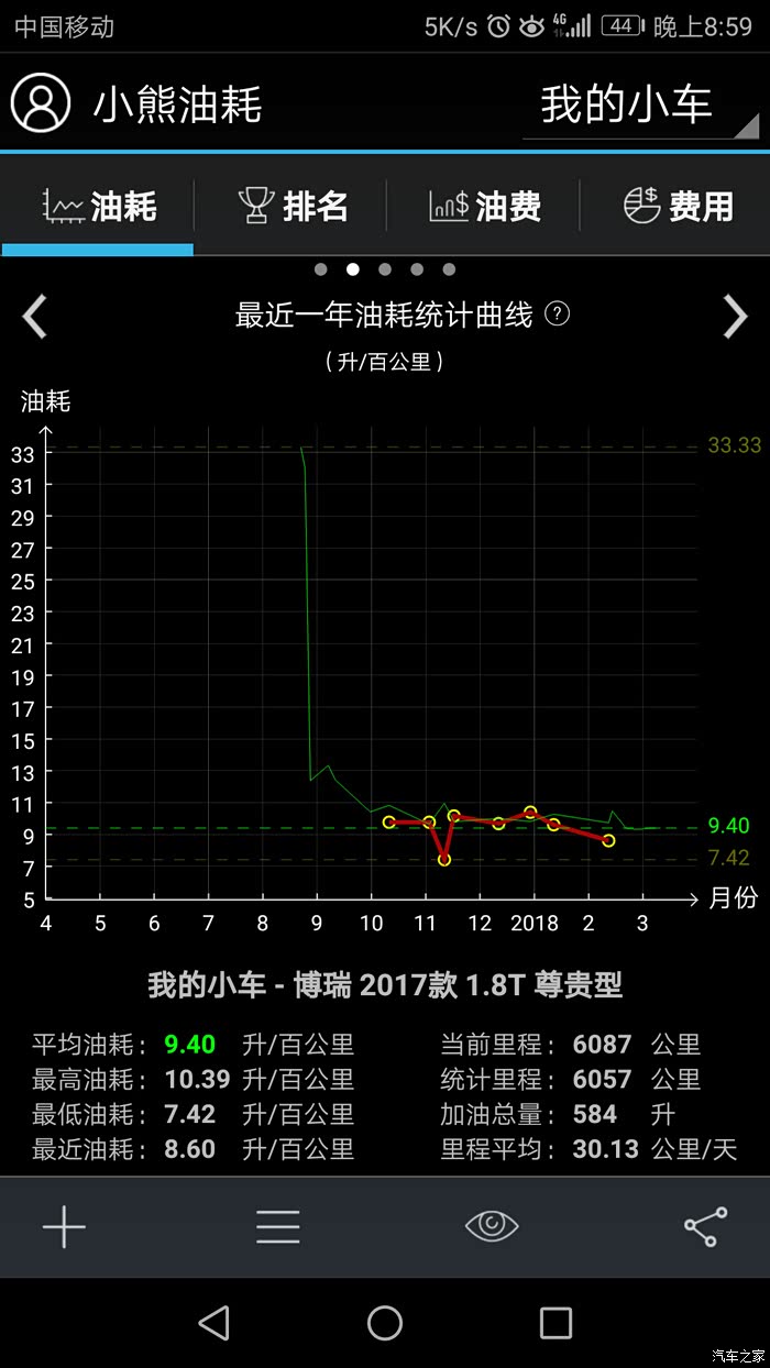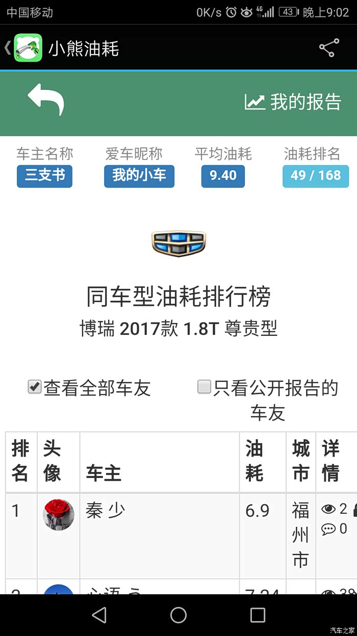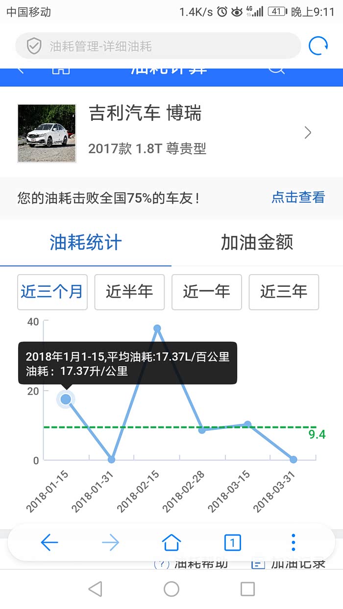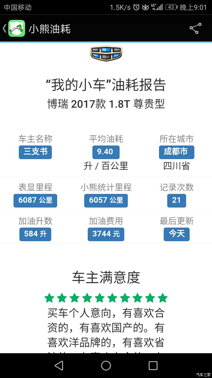 自从09年1月购吉利远景车后,就一直对吉利关注,到博瑞问世到面世,就钟情于她,直到17年中,等了整二年有余,因不愿做小白鼠。终于在去年8月17日入手成熟车型——17新款博瑞,21日到手,用车半年有余,除3千公里去保养处理副驾上方天窗处异响外,整车性能优异,感受非常,吉利进步非常之大。异响的产生就是在保养时完美解决,原因就是引到遮阳扳的照明线在车顶上方与天窗之间的内部那个连线触太大头与周边车顶壁相碰产生的共振,用泡沫垫包裹即可。现将用车数据直接上传,话不多说,直接上图,真诚交流,完整数据,好坏自知,真实感觉,不喜勿喷。