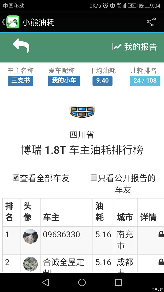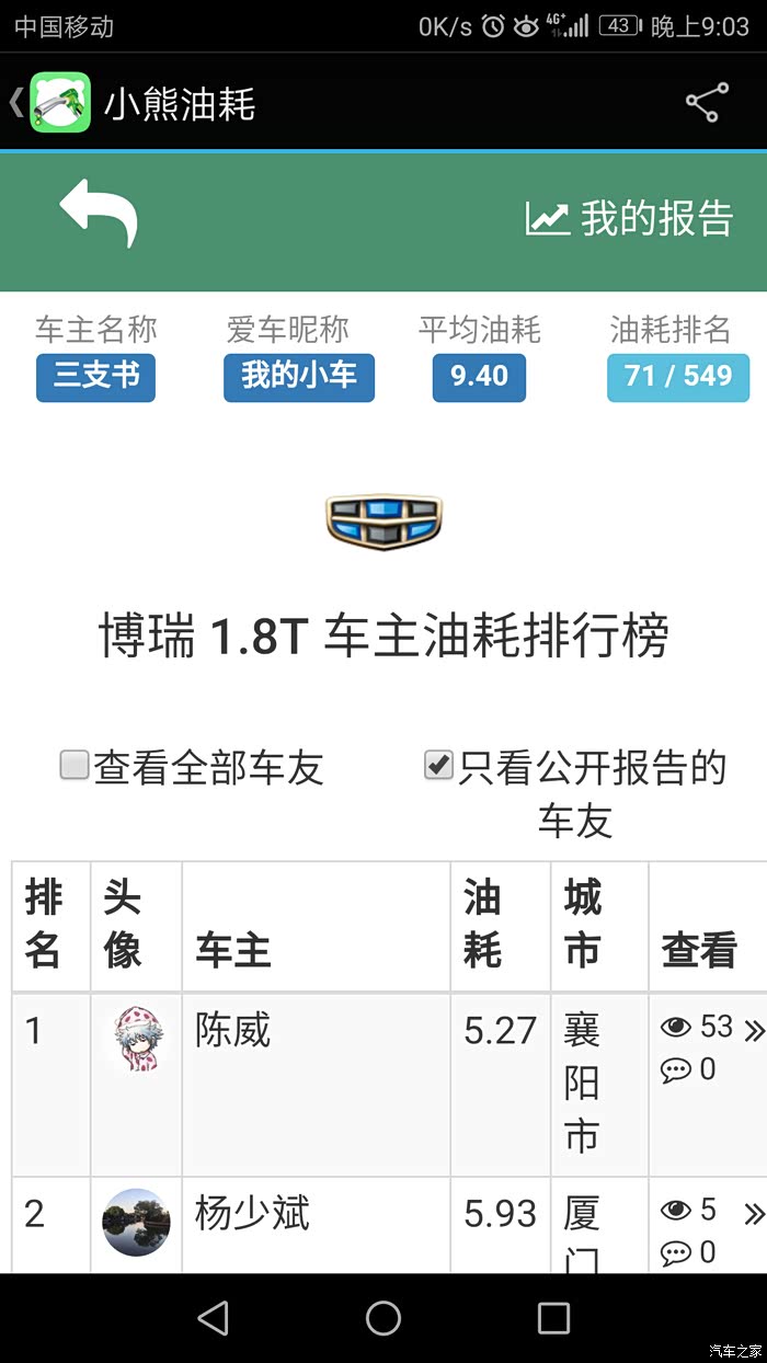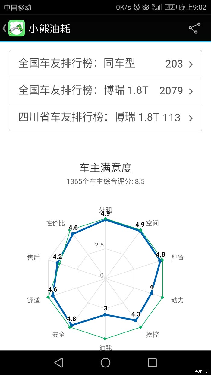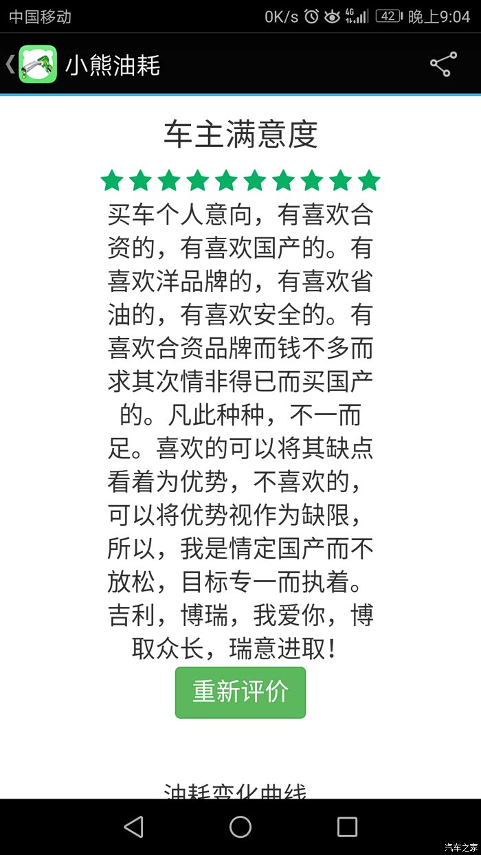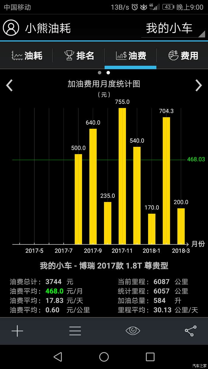 自从09年1月购吉利远景车后,就一直对吉利关注,到博瑞问世到面世,就钟情于她,直到17年中,等了整二年有余,因不愿做小白鼠。终于在去年8月17日入手成熟车型——17新款博瑞,21日到手,用车半年有余,除3千公里去保养处理副驾上方天窗处异响外,整车性能优异,感受非常,吉利进步非常之大。异响的产生就是在保养时完美解决,原因就是引到遮阳扳的照明线在车顶上方与天窗之间的内部那个连线触太大头与周边车顶壁相碰产生的共振,用泡沫垫包裹即可。现将用车数据直接上传,话不多说,直接上图,真诚交流,完整数据,好坏自知,真实感觉,不喜勿喷。
