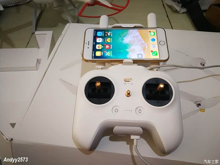 机身安装完成。遥控器方面就简单啦,拉开遥控器上方的手机固定架,卡上手机。