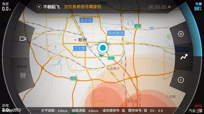 已连接无人机。红色的圆圈是禁飞区域。哦。对了。玩大的无人机还要去民航局实名备案。一定要备哦。万一飞的时候被人家收了就惨了。