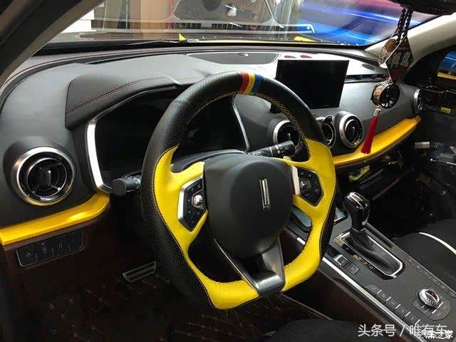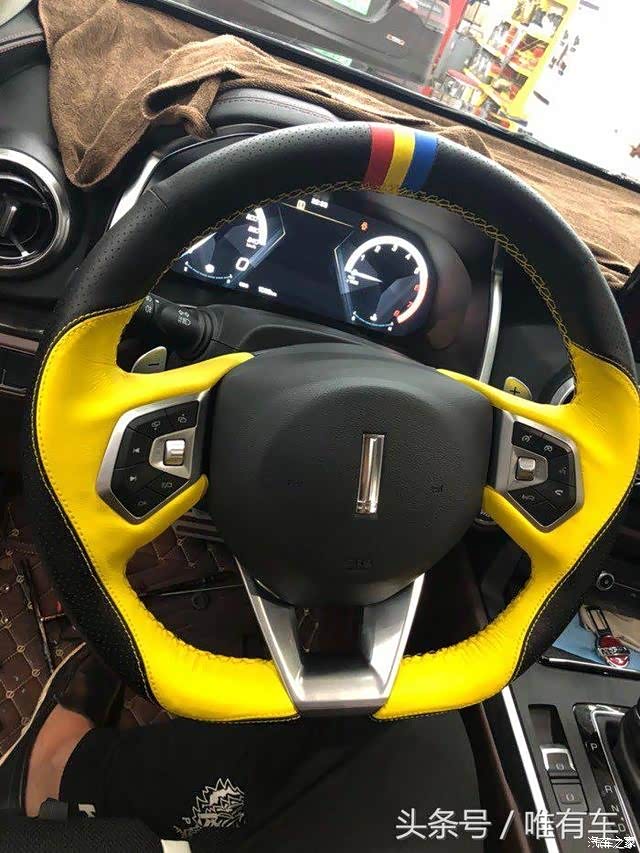 弄了一个里外接近的同色的专用方向盘套,如果太厚,夏天容易出汗,建议大家夏天选择薄些质感的手把套。在氛围灯外面的地方,还同等设计黄色线条搭配方向盘。