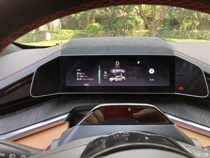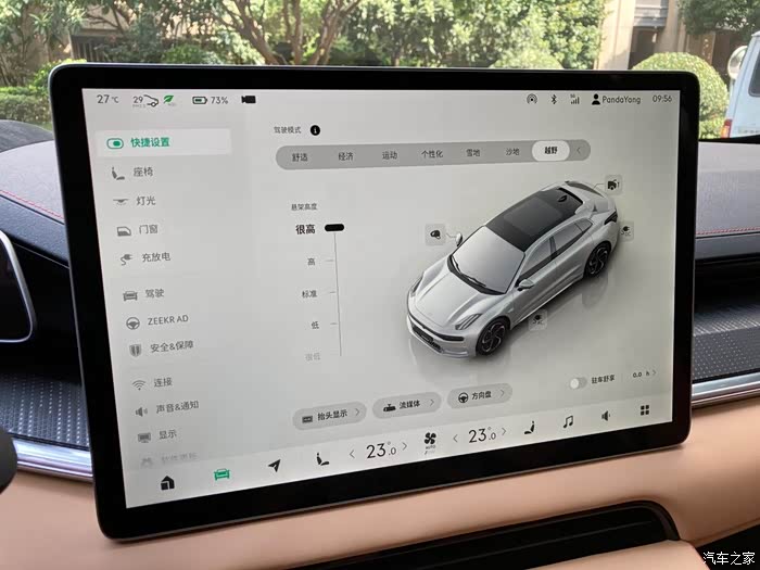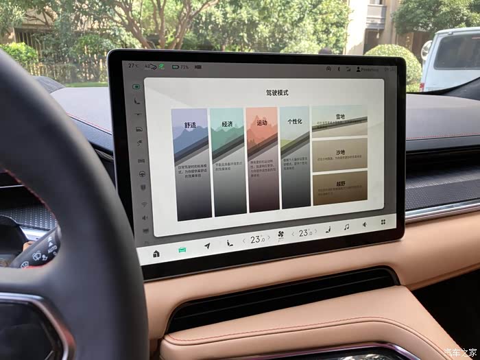 【舒适模式】也是我日常使用最多的一个模式。在这个模式下,车子的油门响应是很舒缓的感觉,即使大脚踩下去也不会觉得很蹿,这时候电机的最大扭矩介于经济模式和运动模式之间,而且方向盘的转向力度也处于最轻的状态,空悬的高度则被放在了标准,日常代步驾驶或是新手都可以轻松驾驭。