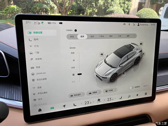 【经济模式】顾名思义主要是为了降低能耗,这时电机的最大扭矩的限制最大,油门响应相比于舒适模式也更加迟缓,为了降低风阻空悬也会把高度降到低,同时空调会从自动转为节能模式,这样一来就可以大大增加续航,在电量较低的情况下最为适用。