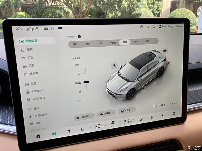 【雪地模式】我还没尝试过,只看过一些车友的分享和官方的一些材料。综合这两部分来看,在雪地模式下,极氪001在起步、过弯和控制方面都有着更特殊的调校,电机扭矩上升更加缓慢,后轴扭矩分配的比例更低,依托dTCS减少打滑,让车子处于一个更偏重于前轮扭矩的四驱状态,最大程度上避免失控和打滑。