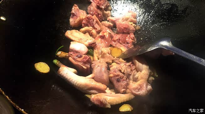 热油起锅,姜片,葱姜爆香,主要于避免鸡肉的腥味