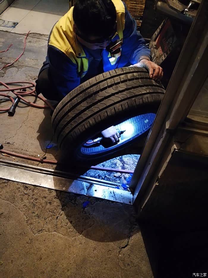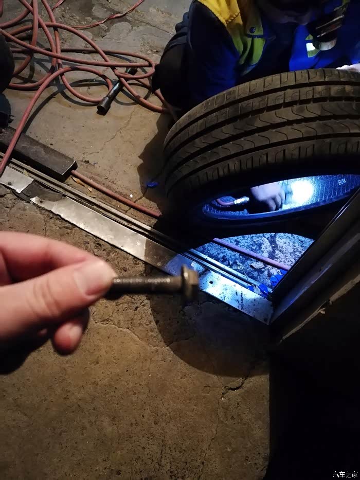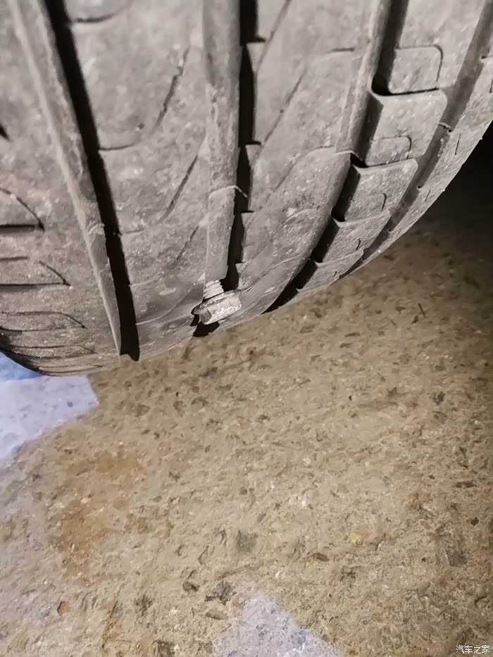 晚上去健身,回来的时候系统突然报警了,提示左后轮气压不足,下车检查发现扎了一个大螺丝钉