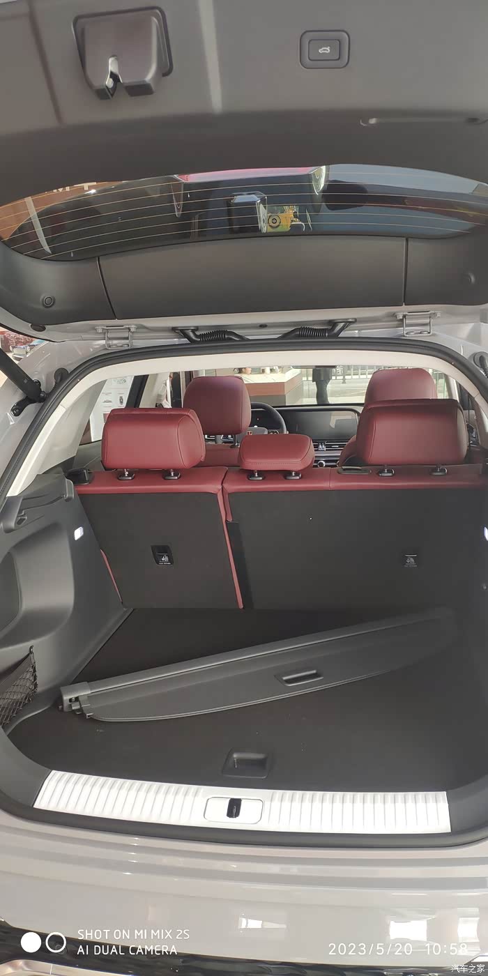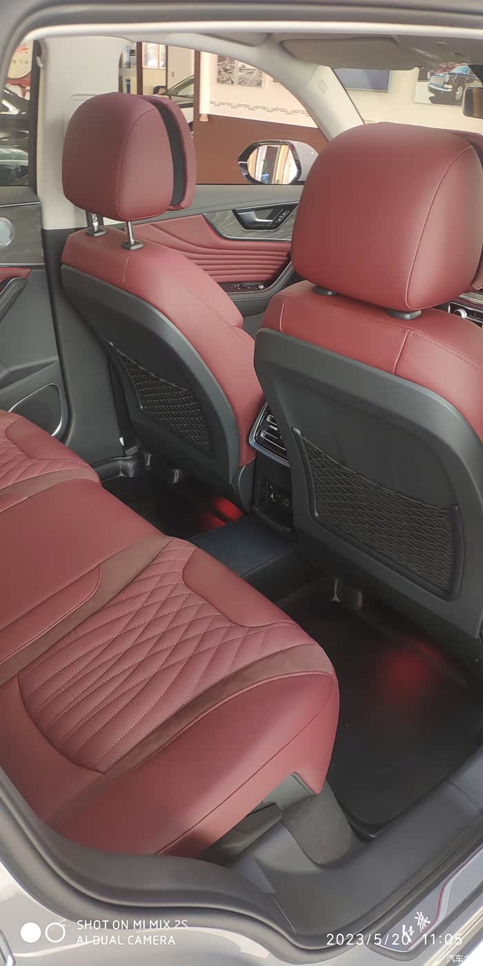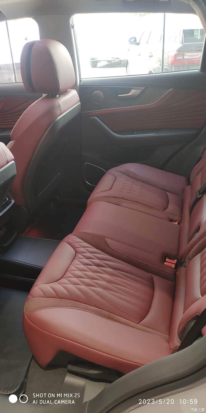 后排空间还是那么宽敞,让我这个一米8的身高坐进去毫无压迫感,舒服自在。敲个二郎腿也没问题。酒红色的内饰就是高级。