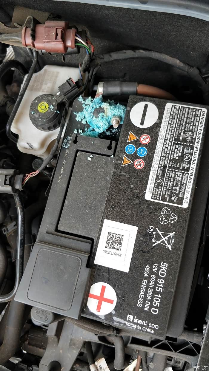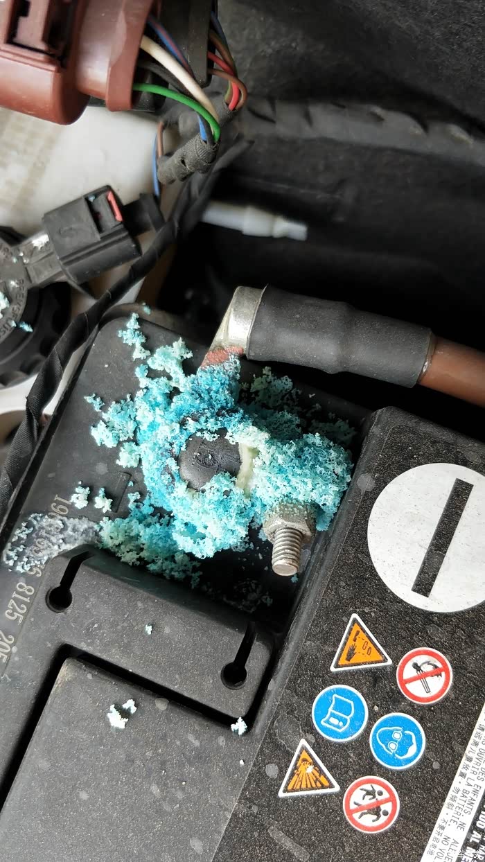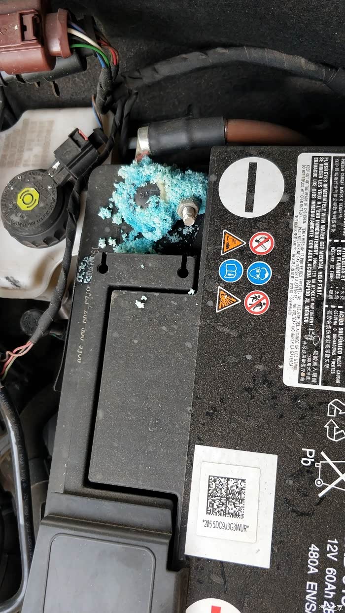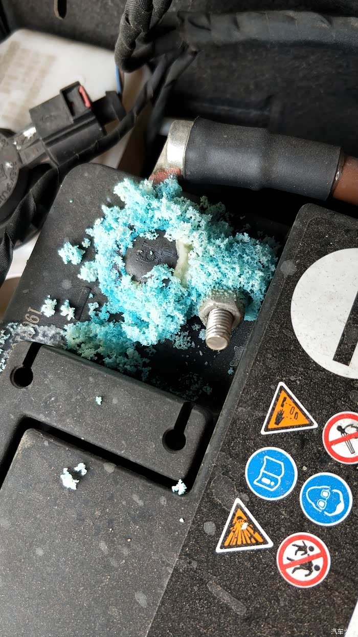 今天打开发动机舱,发现电池负极有许多蓝色颗粒状组织,不知道是怎么回事,今天下午去4S店看看