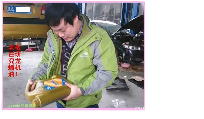 两三位店内的老师傅在观察对比,包括和店内的全合成机油作颜色、粘度等等对比。