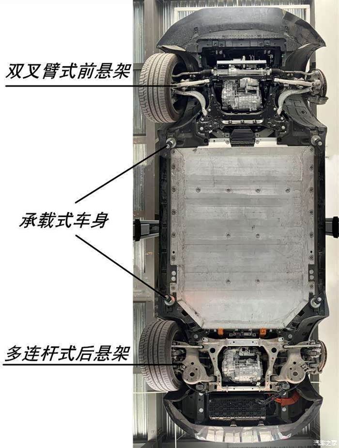 为提升整车的安全性能,极氪001运用了大量的铝合金件来提升整车的刚性。前交叉臂后多连杆式独立悬架、全框式副车架罕见地使用铝合金材质,大大提升了整体刚度,而且实现了轻量化。后副车架能够完全包裹住后电机,为动力总成和悬架系统提供了充足的刚性支撑,并能够在发生撞击时有效吸收正面冲击。