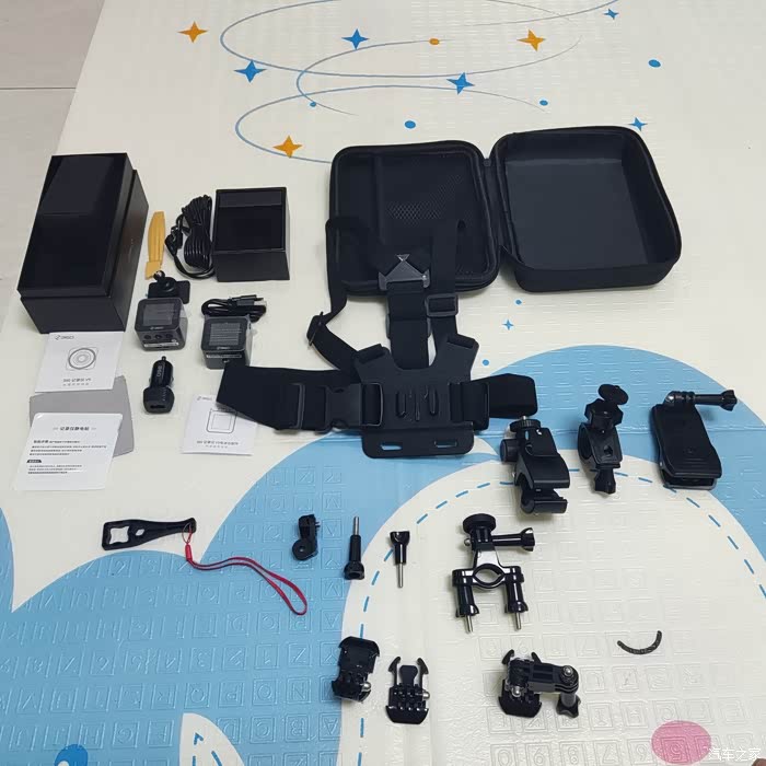 拆开包装后,有车载行车记录仪使用的电源线和点烟器插头电源,还有满满的户外配件,有可以穿戴的胸前拍摄支架、夹子、骑行支架,完全满足户外拍摄所需。