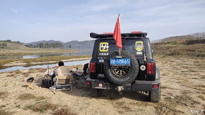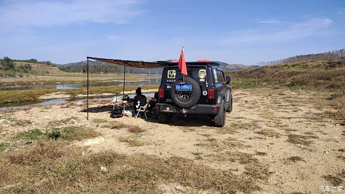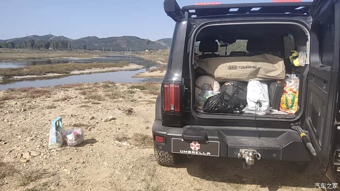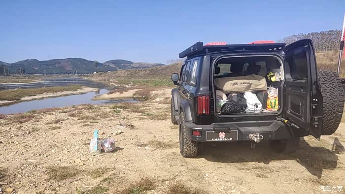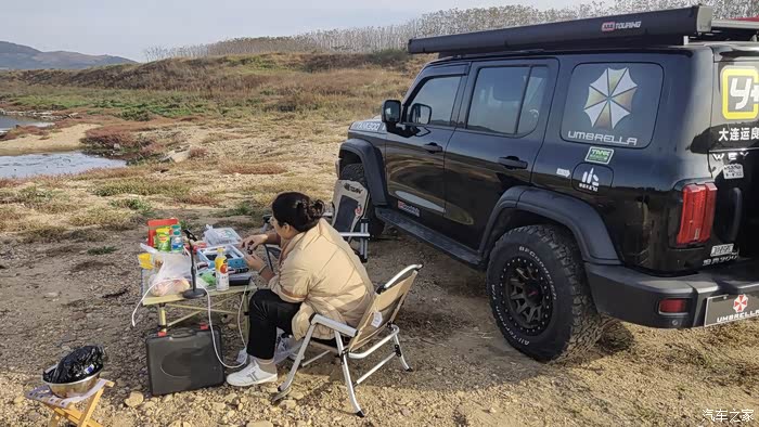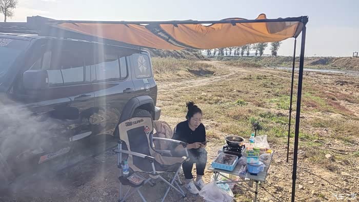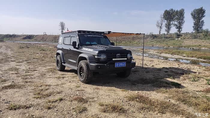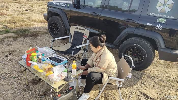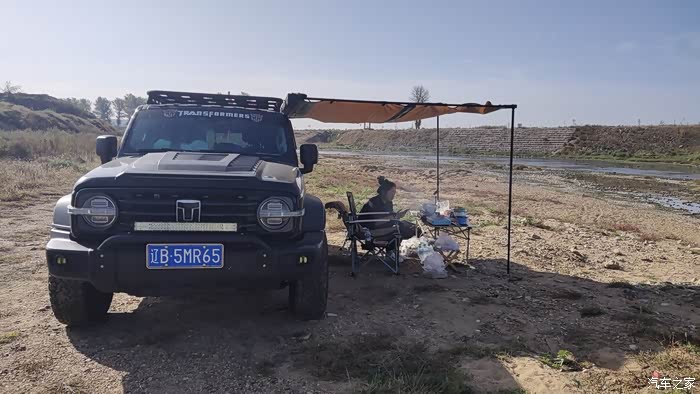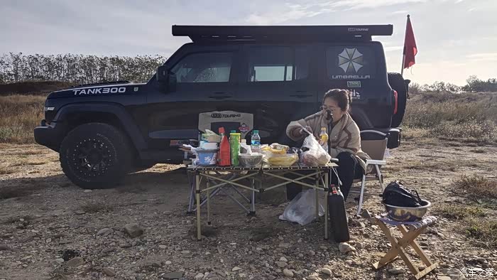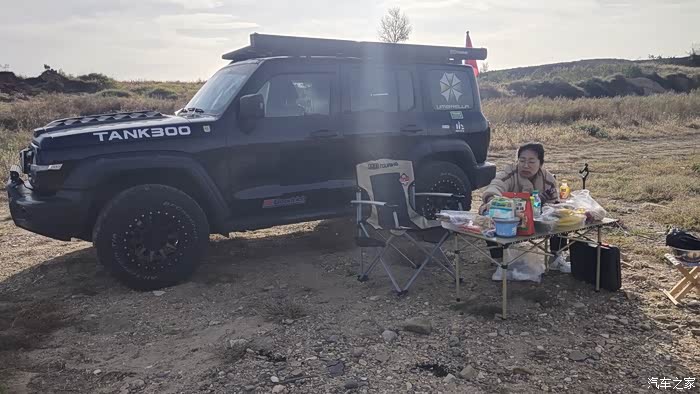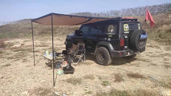 上午的太阳还没有照到头顶,暂时可以不用打开侧帐,可以利用坦克300高大的车身来遮挡一下阳光。