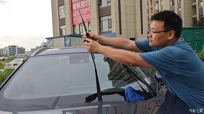 带上厚毛巾出门,先在车辆断电时把雨刷拨到前挡风中央。现在的雨刷是快装的,按方块按钮往上拔就能取下旧雨刷。支臂是铁的,要用厚毛巾垫着,防止打烂挡风玻璃。