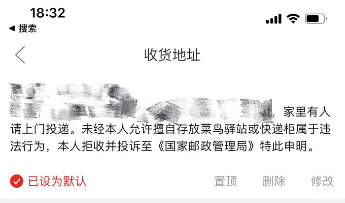 4、菜鸟驿站投诉完毕后,打开X宝或者其他都会送驿站的电商平台,修改你的收获地址,在你的详细地址后面加上一段话(如下图所示):请上门投递家里有人,未经本人允许擅自存放菜鸟驿站或快递柜属于违法行为,本人拒收并投诉至《国家邮政管理局》特此声明。