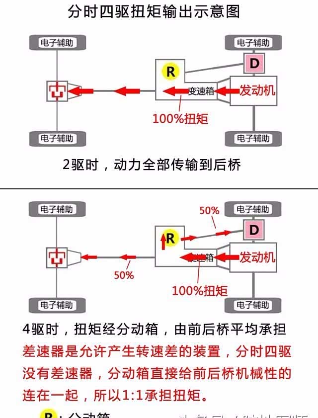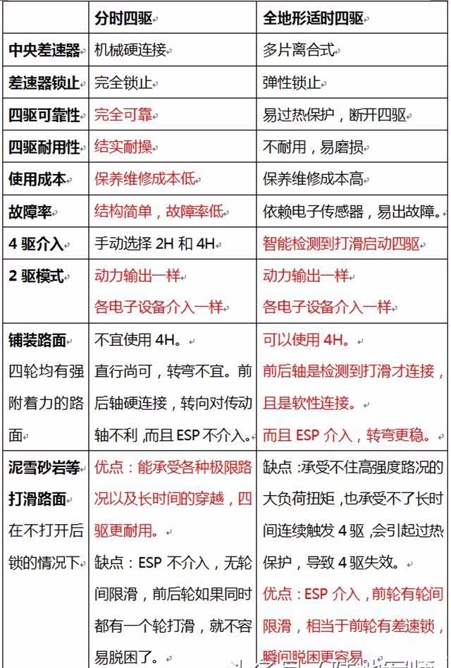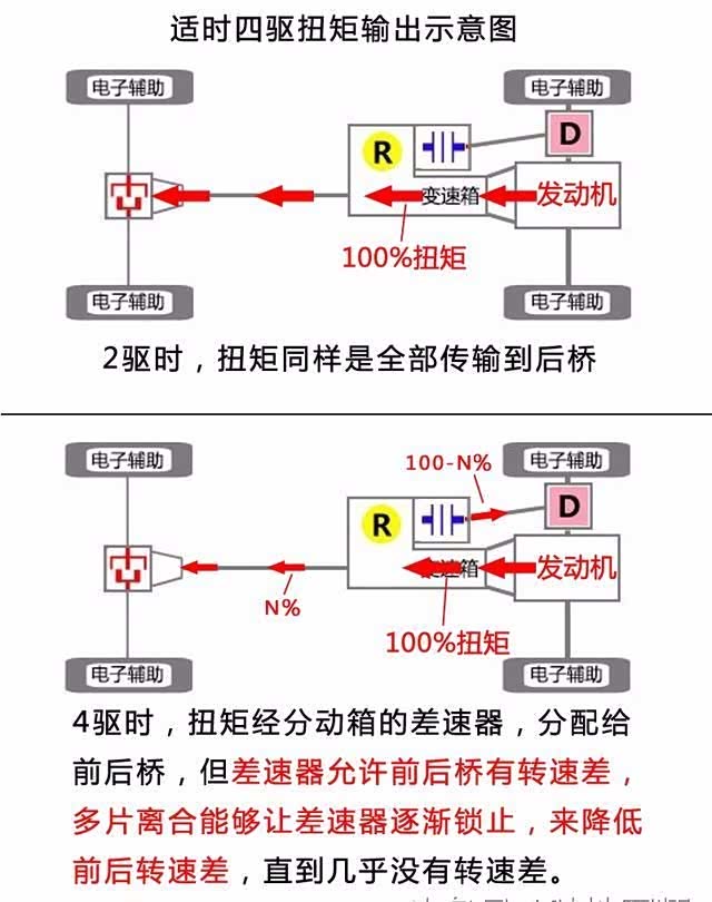 适时四驱有中央差速器,前后允许有转速差。但多片离合也能锁止,能基本实现前后1:1承担,也跟据路面来分配前后动力。但离合片高强度或长时间负荷会起热,起热了会强行解除四驱。适时四驱确且来说是一种被动四驱,是一种纠正性四驱,只有在主动轮出现打滑现象后,为了纠正这种打滑,才启轮间限滑功能。因为前后桥不是锁死的,可以有转速差,所以ESP车身稳定系统和轮间限滑功能能正常工作。有中锁后锁轮间限滑功能算是2.5把锁。