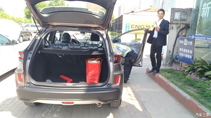 后备箱红色袋子里的是提前买的行车记录仪和挡泥板,上完牌回4S店让帮忙装下