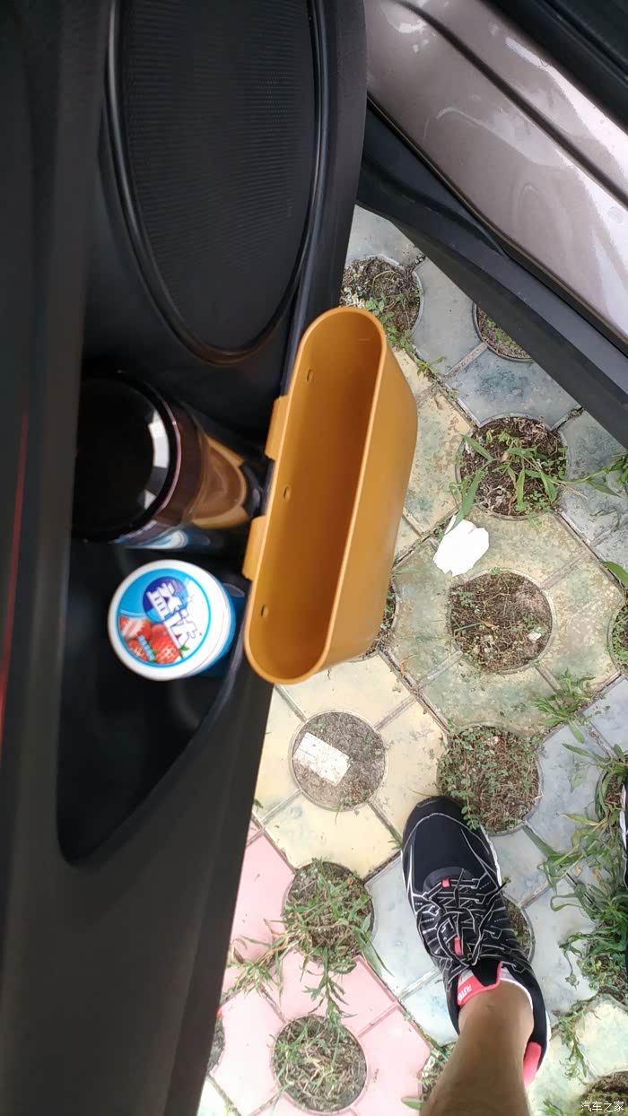 后来买了4个这样的垃圾桶,不过按门上进出容易踢掉,后面2个给挂到坐垫的绑带上了