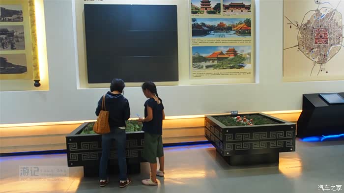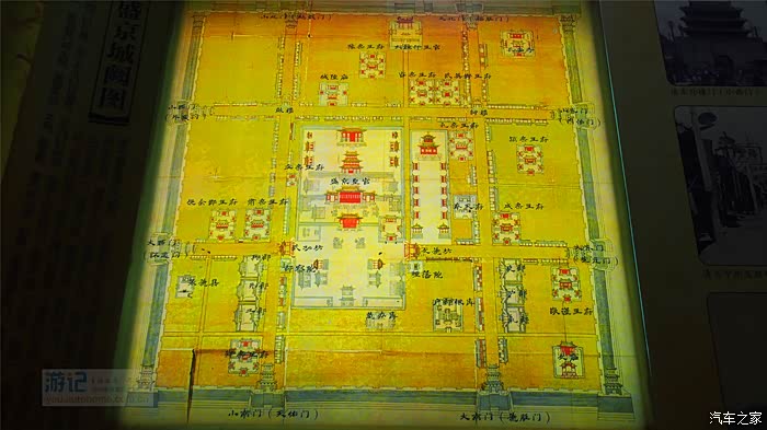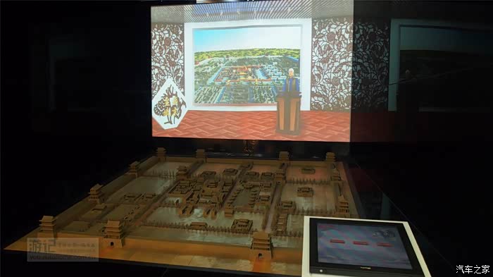 平面上是模型,墙面上投影播放着故宫的宣传片。