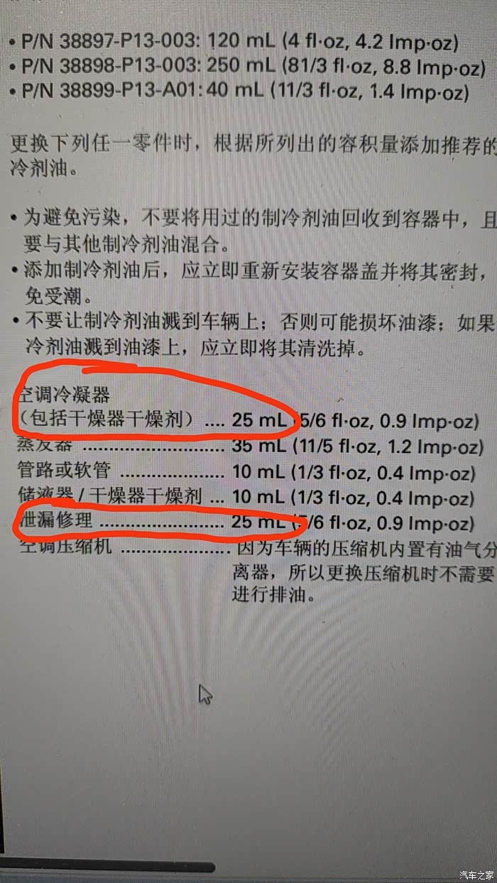 维修手册推荐的加入量如图,冷凝器更换是25ml,可能意思是旧冷凝器里有25ml被换走了。维修项目里还有个“泄露维修”25ml,个人理解为制冷剂泄露是带走的25ml。现在问题是,更换冷凝器,也需要释放制冷剂,那么是不是需要加入两个项目的油量,暨50ml