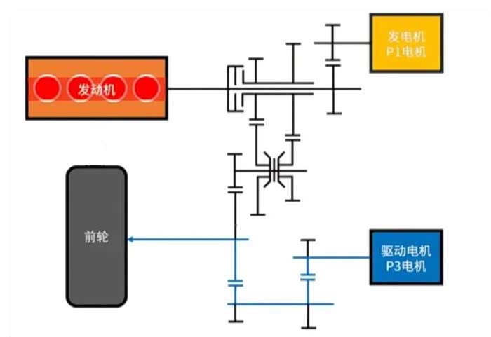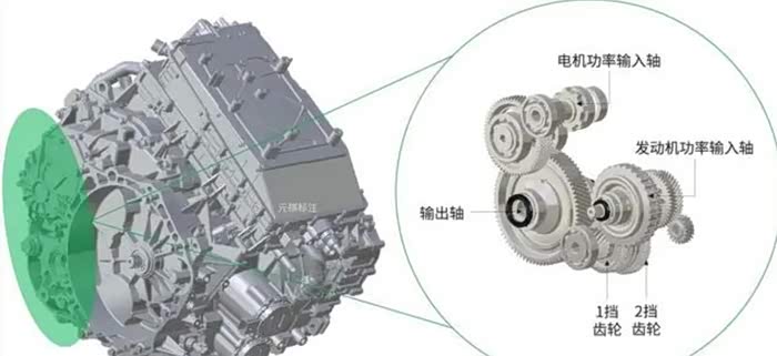 马赫电混DH-i的设计初衷就是为了解决ECVT高速不省油和DHT换挡顿挫的问题,最终各取所长组成了一套具备四个挡位的混动系统。在硬件构成上,马赫电混DH-i使用了一个行星排,相当于2个档位,再加上两对齿轮构成高速档和低速档,因此形成了“四挡”。两个电机分别放在了P1和P3的位置,另外还有四套同步器。