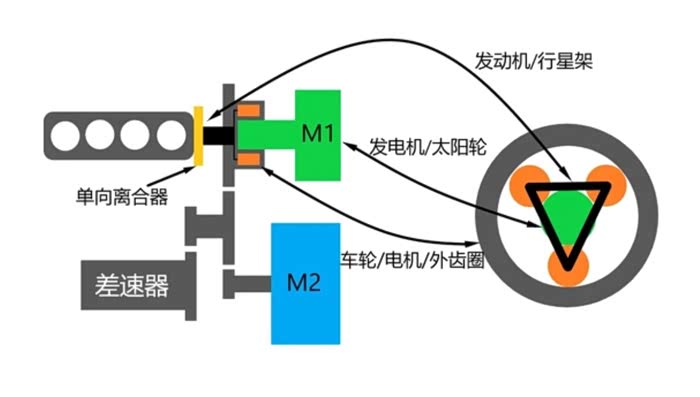 之所以会出现这样的问题,归根结底还是在ECVT的设计上。之前我们也讲过行星齿轮组的工作原理,那么在THS系统中发动机、发电机、电机三者通过一个行星排耦合在一起。结构上,发电机与太阳轮连接,发动机与行星架连接,电机与外齿圈连接并通过主减速器与轮端连接。