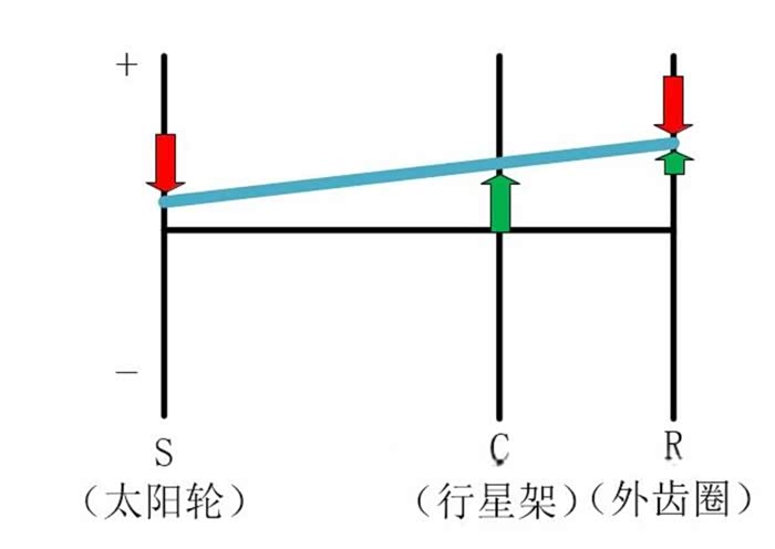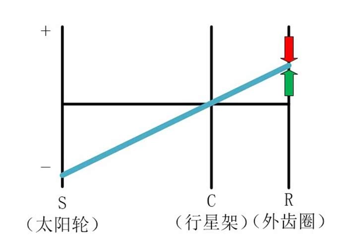纯电模式下,发动机、发电机不工作,电机单独驱动轮端,由于发动机摩擦力较大,发动机不会转动,但发电机会反转。纯电模式下正常驱动行驶的杠杆图如下,图中+号-号表示转速方向,绿色箭头表示电机扭矩(向上为正),红色箭头表示轮端阻力矩(向下为负)。