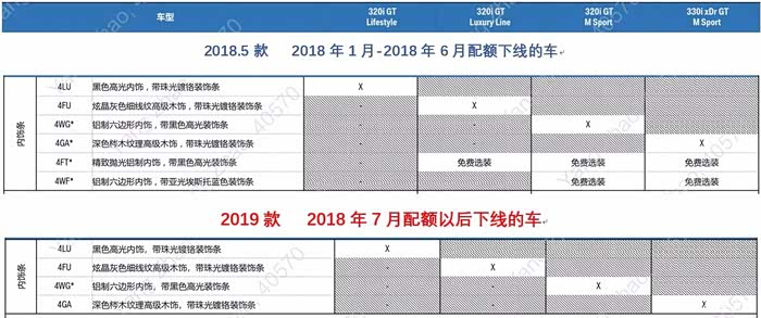 改款前,320GT豪华有2个可选内饰条;320GTM有3个可选内饰条;330GTM有3个可选内饰条;<br/><br/>改款后,每种车型固定为一种内饰条,如图所示:<br/>320GT时尚:4LU 黑色高光内饰,带珠光镀铬装饰条<br/>320GT豪华:4FU 炫晶灰色细线纹高级木饰,带珠光镀铬装饰条<br/>320GTM套:4WG* 铝制六边形内饰,带黑色高光装饰条<br/>330GTM套:4GA 深色梣木纹理高级木饰,带珠光镀铬装饰条