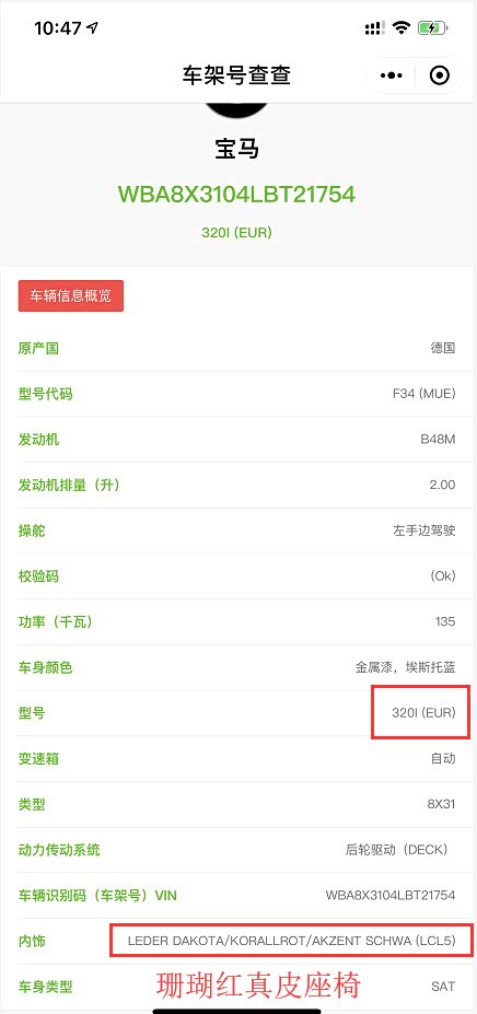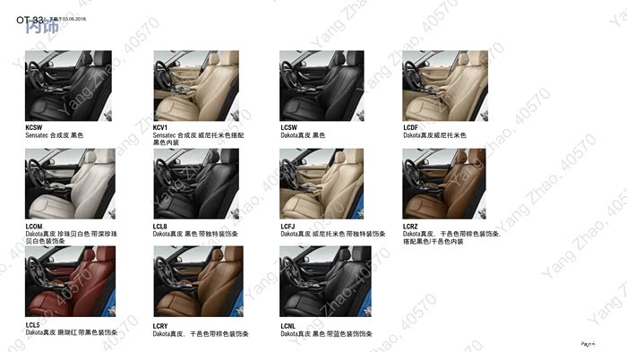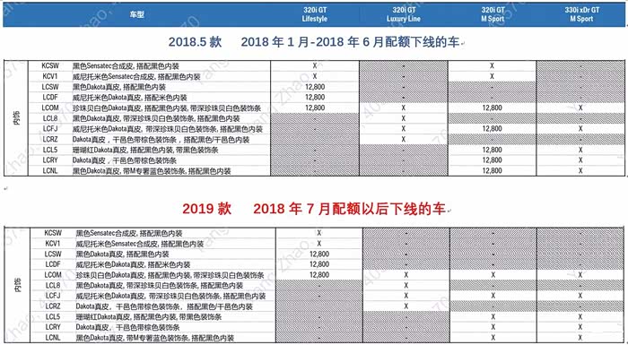 (二)座椅内饰→第一个改动的部分<br/>2019款在2018款的基础上,主要改动在于320GT M套的车型,<br/>320GT时尚、320GT豪华以及330GT没有任何变化。<br/>320GTM套在18年款期间标配的为仿皮也就是革的黑色或者米色座椅,可以选配5种真皮座椅,选配价格12800元。<br/><br/>从2018年7月配额开始:<br/>320GTM直接标配真皮座椅,即5种真皮座椅可以免费选装定制。<br/>如下表:<br/>包括:<br/>①LCOM 珍珠贝白色Dakota真皮, 搭配黑色内装, 带深珍珠贝白色装饰条<br/>②LCFJ 威尼托米色Dakota真皮, 带深珍珠贝白色装饰条, 搭配黑色内装<br/>③LCL5 珊瑚红Dakota真皮, 搭配黑色内装, 带黑色装饰条<br/>④LCRY Dakota真皮,干邑色带棕色装饰条<br/>⑤LCNL 黑色Dakota真皮, 带M专署蓝色装饰条, 搭配黑色内装