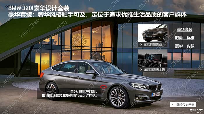 320GT豪华车型外观增加了前后镀铬饰条。侧面“Luxury”标识取消。<br/>其他和老款比没区别。<br/>实际上,同样指导价的320GTM比320GT豪华在配置上更值钱,以前320GT豪华起码还多了真皮座椅,现在两款车都有真皮座椅了以后,320GT豪华更没有性价比了,基本上选择的人少之又少。。