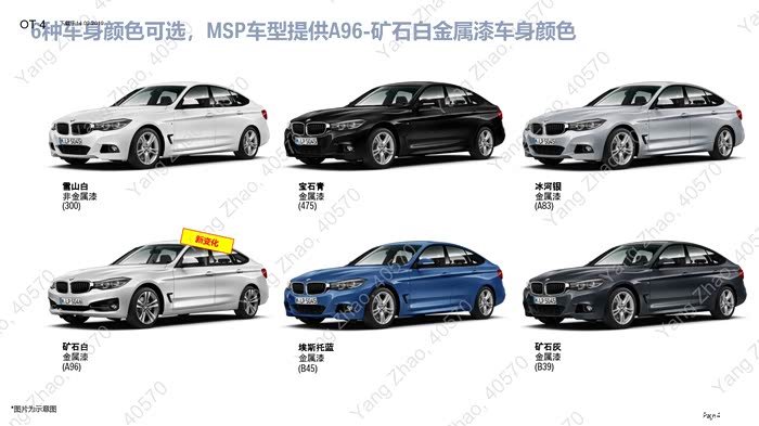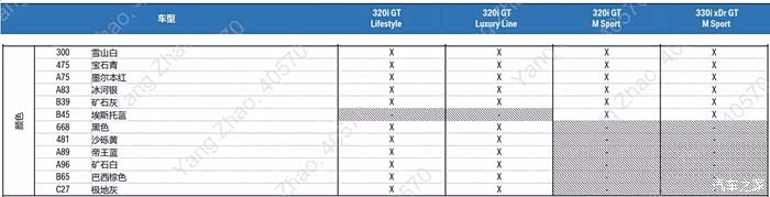 (一)车身颜色<br/>根据订单指引说明,首先是外观颜色没有明显变化,依旧是:<br/>320GT时尚和320GT豪华两款车型可以选配除“埃斯托蓝M专属颜色”外,11种颜色:<br/>包括:<br/>普通漆→雪山白、黑色<br/>金属漆→宝石青、墨尔本红、冰河银、矿石灰、沙砾黄、帝王蓝、矿石白、巴西棕、极地灰<br/><br/>320GTM和330GTM两款车型,可选颜色为六种:<br/>包括:<br/>普通漆→雪山白<br/>金属漆→宝石青、墨尔本红、冰河银、矿石灰、以及M专属颜色 埃斯托蓝。<br/><br/>