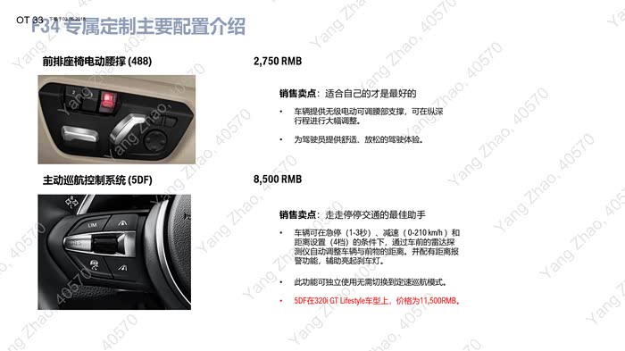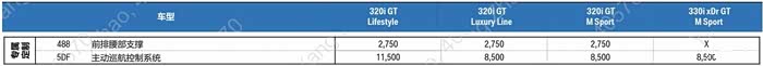 另外,专属套装也是没有变化:<br/>320GT时尚因为没有定速巡航 因此选配ACC自适应巡航是11500元,比以前先选配定速巡航再选配ACC整体还是优惠的。<br/>320GTM+320GT豪华+330GTM选配ACC保持8500元不变。<br/>包含了防碰撞系统和自适应巡航控制系统,是个非常值得选择的安全配置。<br/>