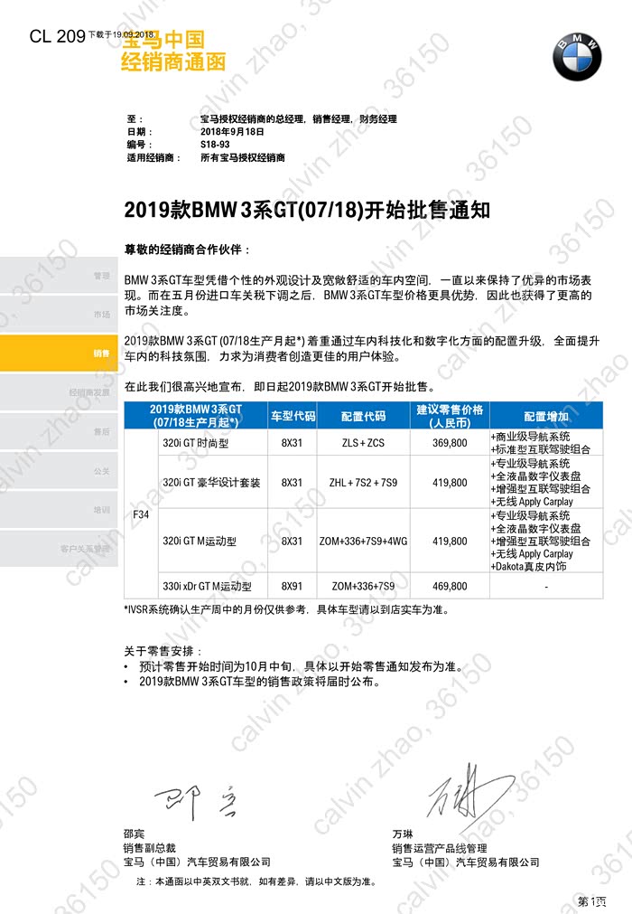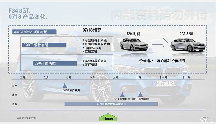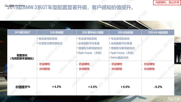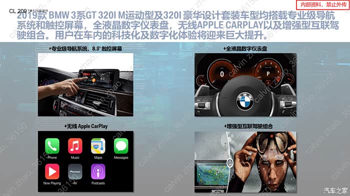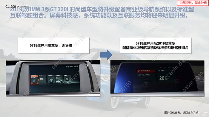 在我6月3日发布第一批19款3GT改款消息以后,有好多同学在4S不承认有新款的情况下知道了这个消息,顺利的跟4S砍了价,还是很欣慰起到了一定的指导作用。<br/>今天在此发布重磅消息!<br/>费劲千辛万苦,到处打探!多方求证!最终!!<br/>终于打探到在6月3日改款变化的基础上,确认了重大增配信息!增配情况如下:<br/>2019款320GT时尚型:<br/>增加标配 商业级导航系统 和互联驾驶功能 <br/>也就是以前320GTM上面那套标准的互联驾驶系统 时尚也拥有了。<br/>也就是说时尚型从7月配额开始,有了导航,屏幕改变,增加了存储功能,以及手机云端互联APP可以使用更多的功能。变相增配2万元。<br/><br/>2019款320GTM和豪华型:<br/>增加标配 专业级导航系统<br/>增加标配 增强互联驾驶<br/>增加标配 APPLE CARPLAY<br/>增加标配 可编程液晶仪表盘~<br/><br/>以上配置至少价值3万元,还只是选配价格来算,如果是外面改装更贵!。<br/>也就是说320GTM套在增加了真皮座椅(12800元)的基础上,又再次增加了3万元左右配置。<br/>其中专业级导航,以前从13年开始都是328GT 335GT 330GT高配车型才有的系统,即拥有可手写的触摸屏+增强互联驾驶+云端互联所有功能+实时路况+人工服务+手写按钮+大主机有20G存储空间+8.8寸大屏幕。<br/>另外液晶仪表就不用多介绍了,那是真的好!<br/><br/>所以 320GT车型此次2019款为大增配!更加值得拥有!