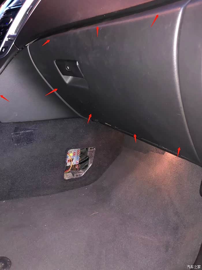 手套箱要拆除~~箭头是螺丝的位置~~手套箱拆下来很麻烦~~不拆的话不好换~~