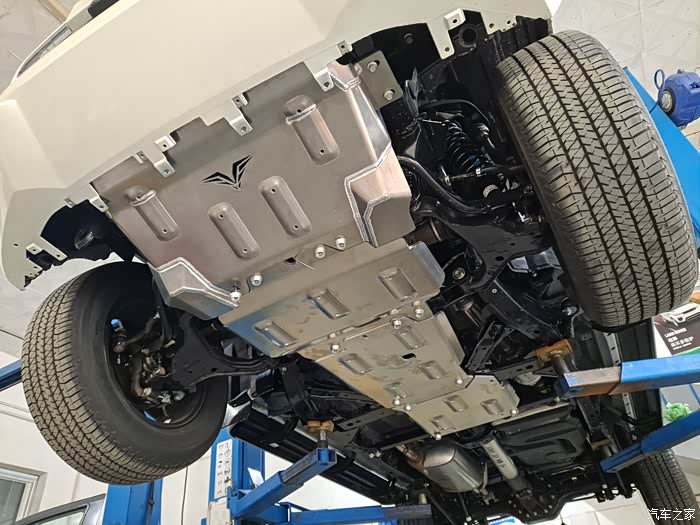 接下来咱们直接进入正题,聊聊我都对途达做了哪些改装。首先是关于越野性能方面的提升。我先对底盘进行了底盘装甲的喷涂。一来可以降低底盘传来的噪音;二来可以加强底盘的防腐和防锈能力。接着是加装了8mm厚的镁铝合金底盘护板,像发动机、变速箱以及分动箱这些都被保护上了。并且镁铝合金相比较传统钢制材料的好处就是轻,并且强度高,最大的缺点就是贵。