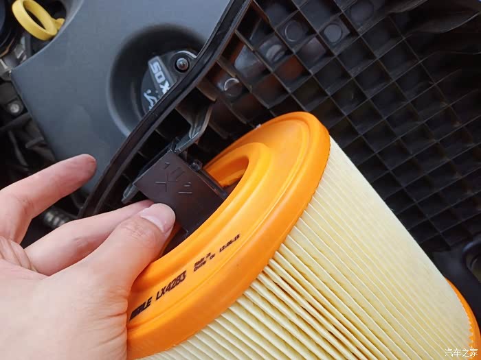 拆空气滤芯的时候按住这个卡扣两边向上提一下就下来了,装上去的时候反过来操作就行。