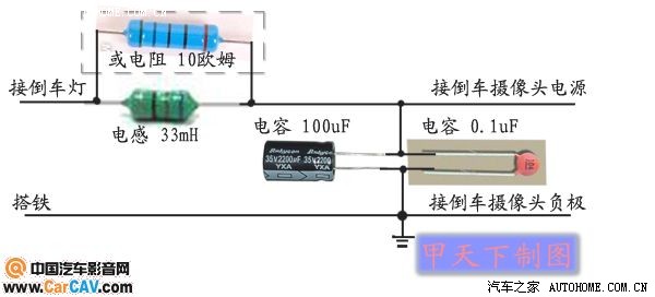 此方法是在倒车灯电源线上加一级滤波电路,将脉冲电源过滤之后,形成直流电源(上图中红色线条就是滤波后的波形),再给摄像头供电。这样就可以完全消除画面上的横条纹干扰。