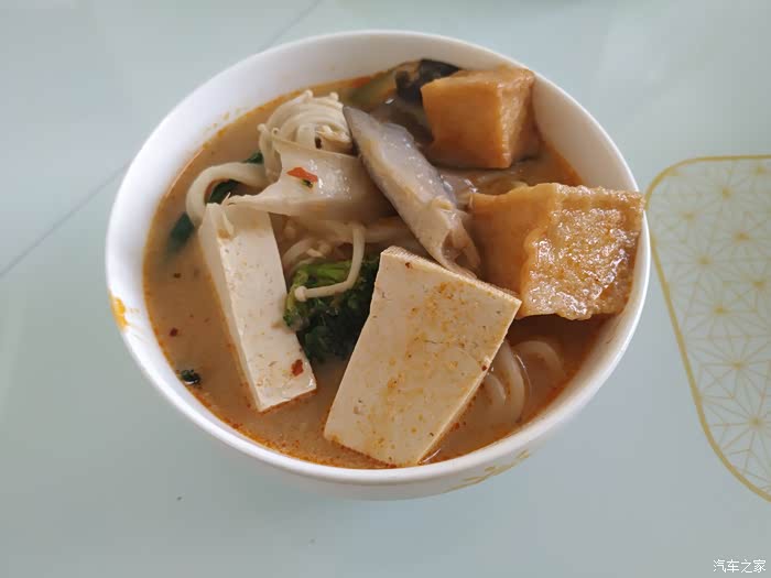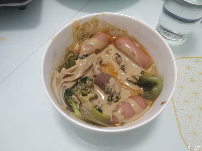 锅里放油,油热放香料,然后放火锅底料,炒香后加清水和牛奶,煮开放入前一天剩下的蔬菜,海鲜丸子,面条,最后淋上麻酱,搅拌均匀,网红牛奶麻辣烫做好啦!