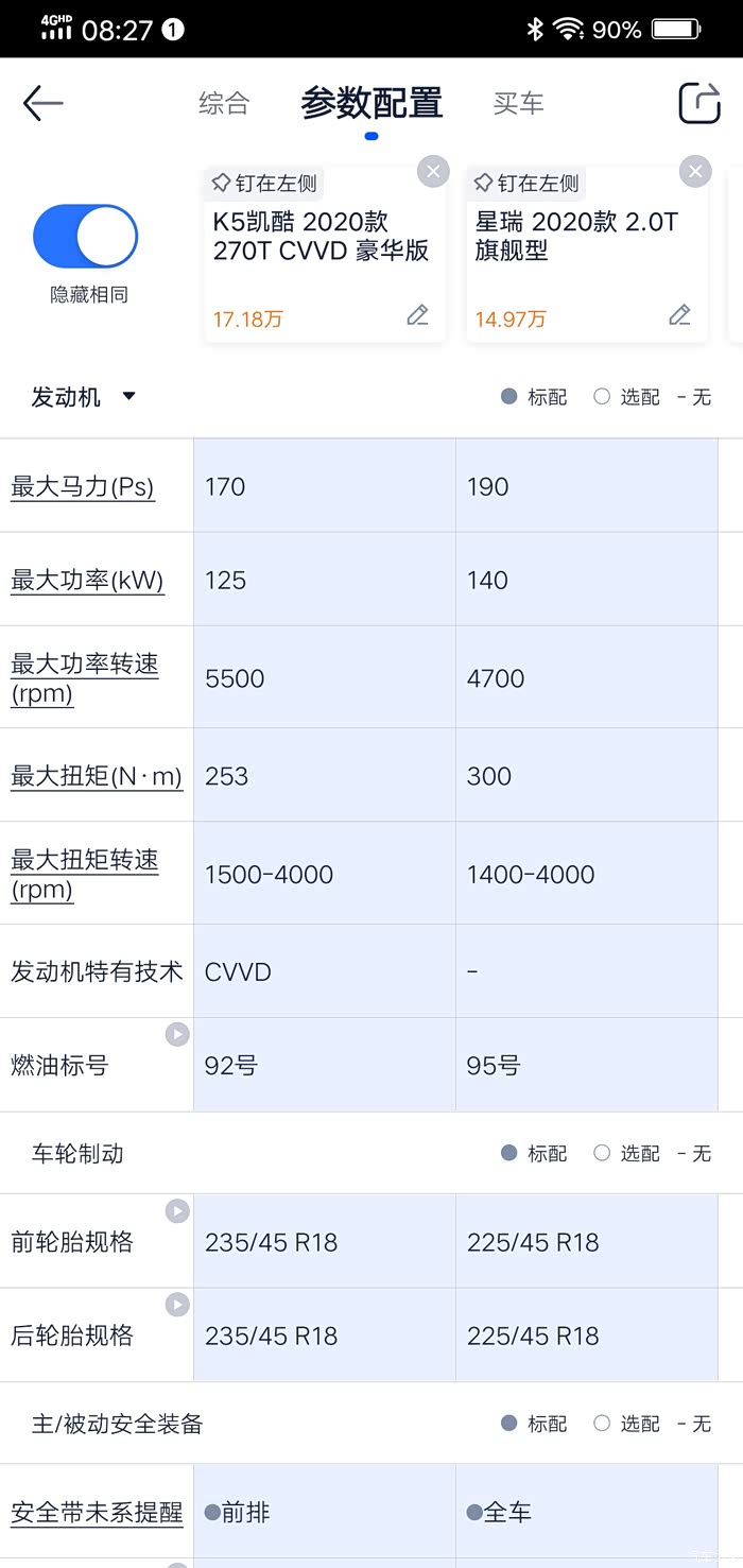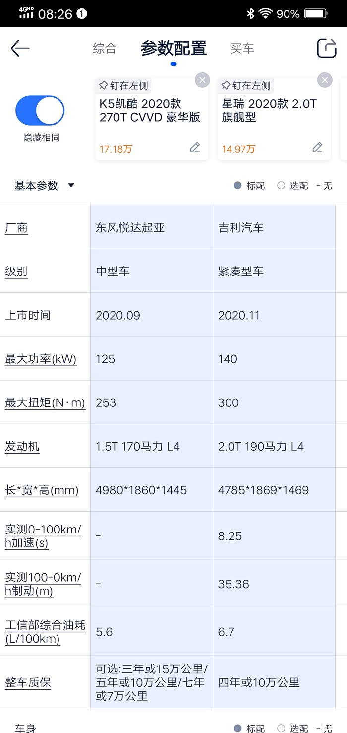 认真地审视一番,你会发现除了一些可有可无的配置,K5性价比会更好,如果你们觉得2.0比1.5的,但也要看看人家是2900轴距,5米的车身,而且1.5更省油,还有液压撑杆后备箱杆及音响包裹等细节用料,对于不是很追求刚需配置的个人更推荐去选K5,但是预算没那么多就选星瑞12.37万的豪华版(纯属个人意见)