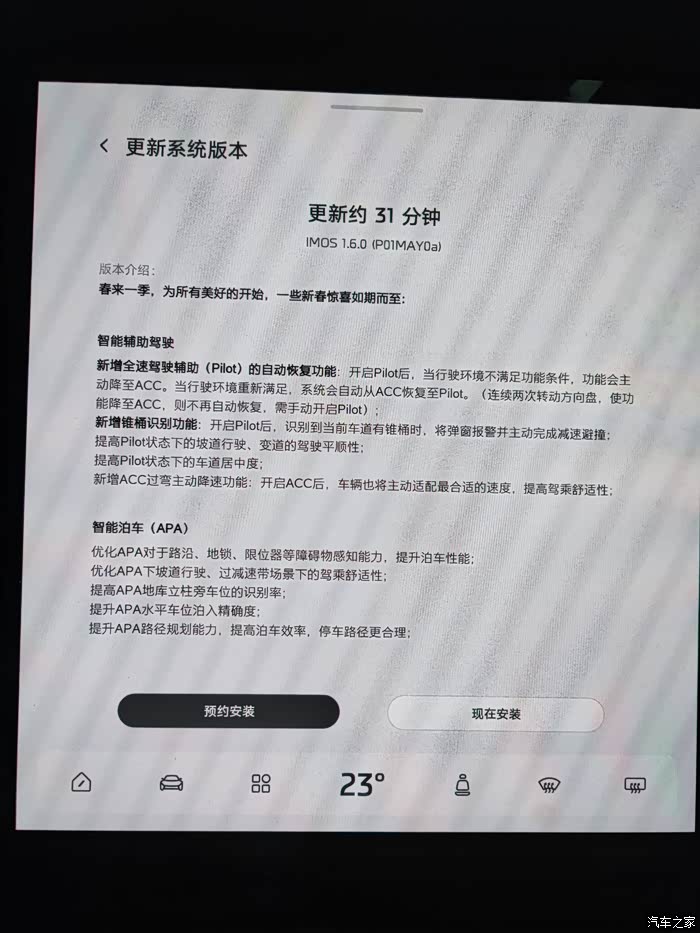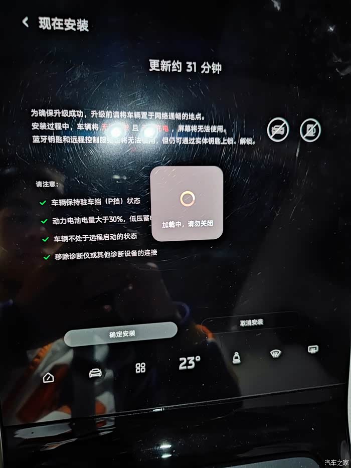 我上一次OTA升级的时候因为不小心给车上了电,导致OTA失败了。重新等待OTA推送等了好多天。所以这次我学乖了,点了现在安装之后就赶快离开主驾。