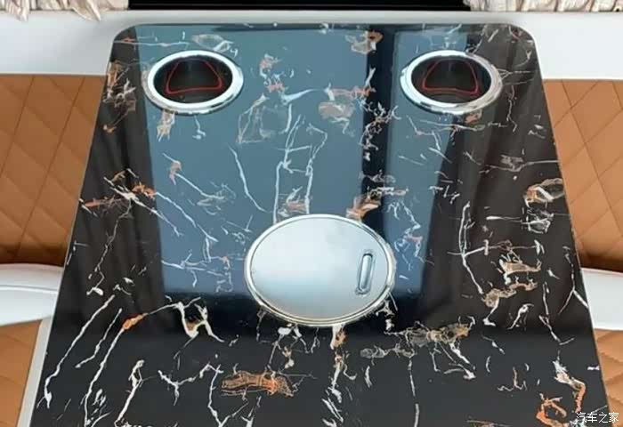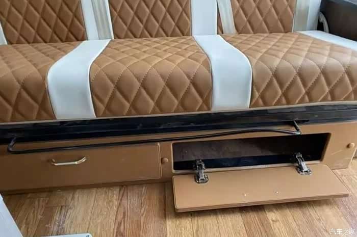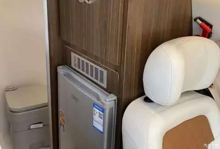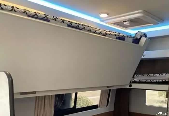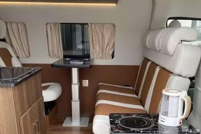 整车6座采用2+3+1设计。满足6人出行,后三排座椅采用折叠式,行驶过程中,可朝前。由于6座空间有限,厨房区的吧台做了分体,在中门处的两侧。整车颜色米白配暖黄,温馨感十足~本车虽采用6座但最大限度保留存储空间,卡座上方吊柜不变,此外在座椅后面增加一个衣柜,可存放行李衣物。冰箱依旧是90升位置设计在衣柜下方。
