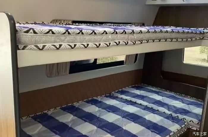 床是上下铺设计,在车内右侧,上下尺寸为1750(mm)x820(mm),上铺可翻转,考虑舒适感床垫采用棕榈垫。本车驻车空调依然采用多美达置顶空调,上铺上方位置增加一个双向排气扇。卫生间保留原有设计,使用便携马桶,热水系统采用小厨宝,随时都能洗上热水澡。