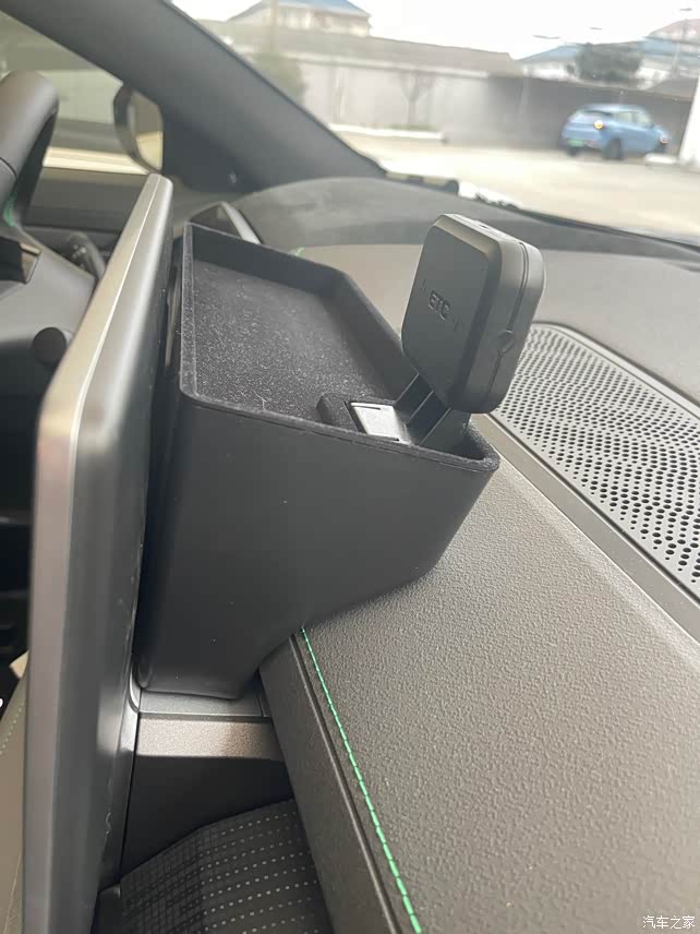 这算得上是放置ETC最好的位置了,相对于贴在玻璃上可能会留胶,储物盒上有一个竖起来的小支架,正好可以将ETC贴在上面,也不用担心会留胶等问题,并且这个储物盒分为上下层,下层可以放一些不常用的小物件,餐巾纸或者玩偶可以放在上层空间。重点是它非常贴合,完全不需要撕开背胶,直接往后面一放就可以了。