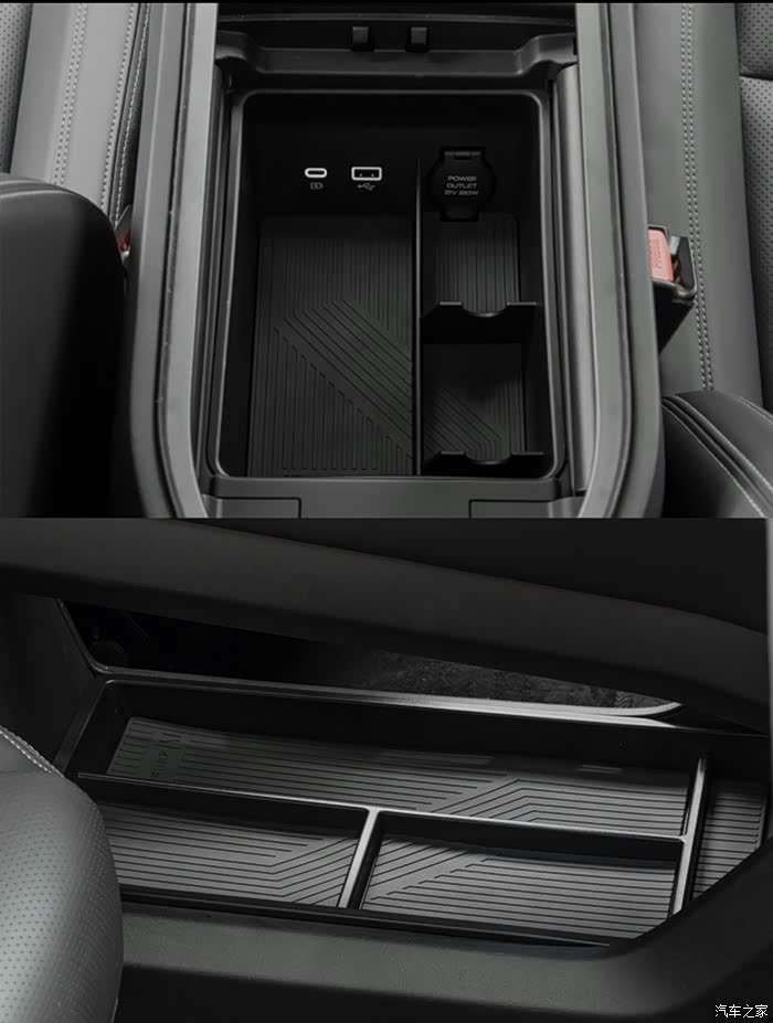 中央扶手箱的空间大小真的很不错,基本媲美大部分的SUV的空间,包括USB、Type-C等接口,质感很不错。建议在商城购买一下扶手箱的储物盒,将不常用的一些物品,比如垃圾袋、整理的充电线、充电宝、整装的口罩等等可以放在扶手箱下面,将常用的身份证、驾驶证、行驶证等物品放在储物盒上部,这样既美观又便于拿取物品。
