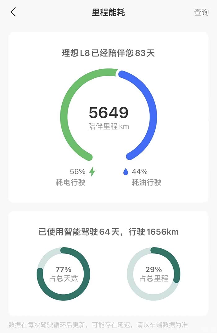 L8的电耗和油耗一般般吧,没有特别 的节省亮点,基本上也能接受,像电耗这半个月以来的实际就是行驶了386公里,电耗是18.1kWh/100km,开得还不是很猛,如果稍微猛点那可能就要到20个电了,而且理想 的电耗显示只是驱动电耗,还不是综合电耗,所以不是很省,这要是到冬天肯定更高,续航里程肯定 要打个8折最少。
